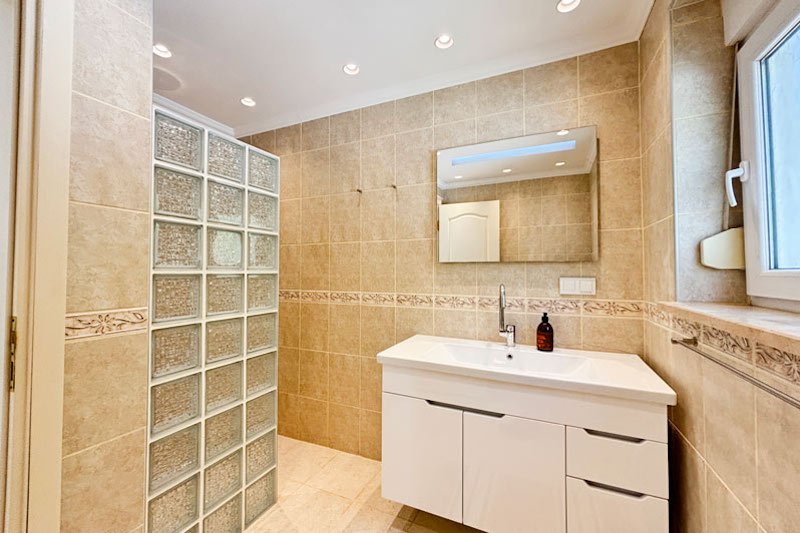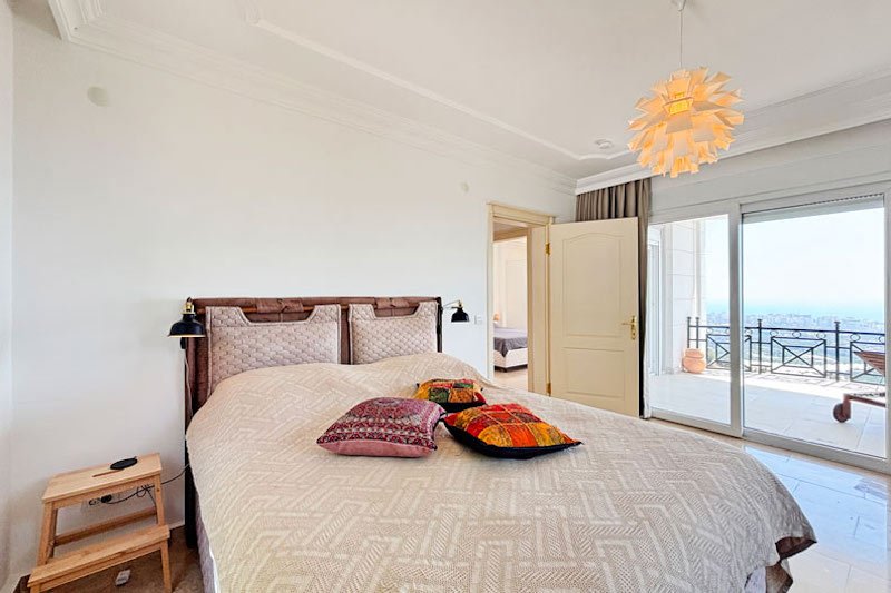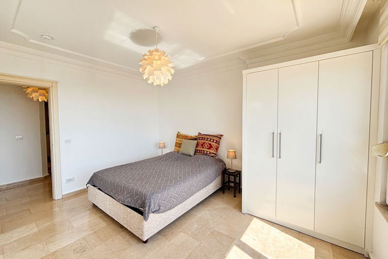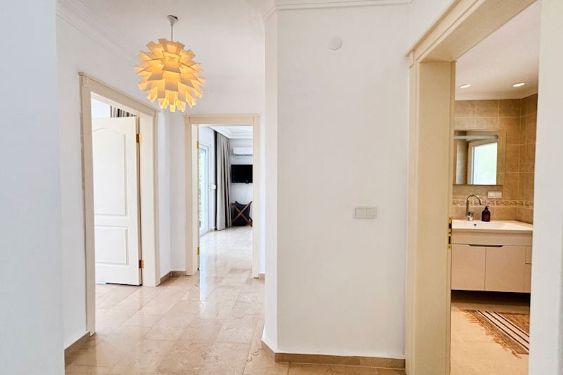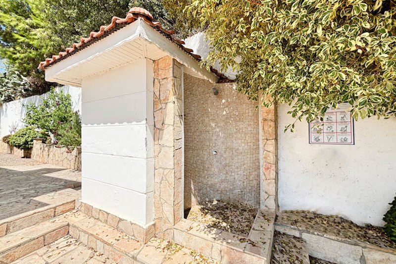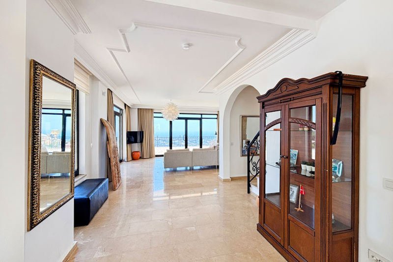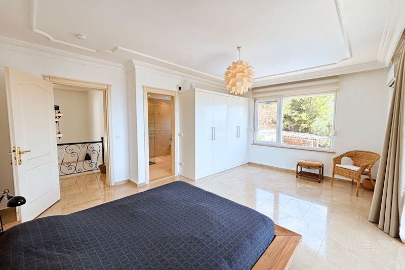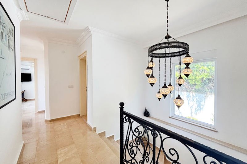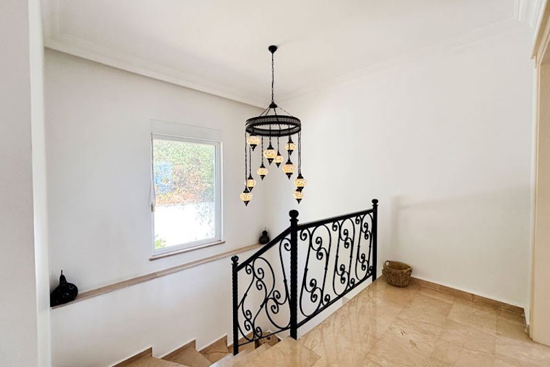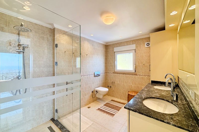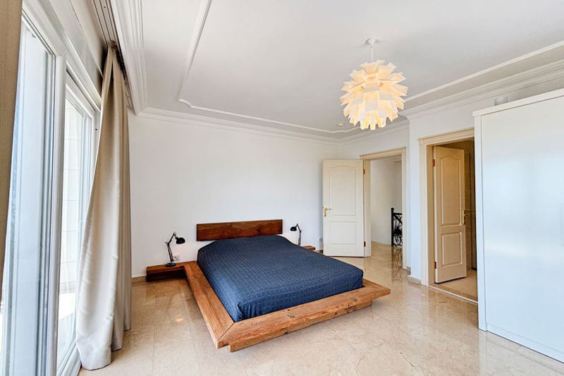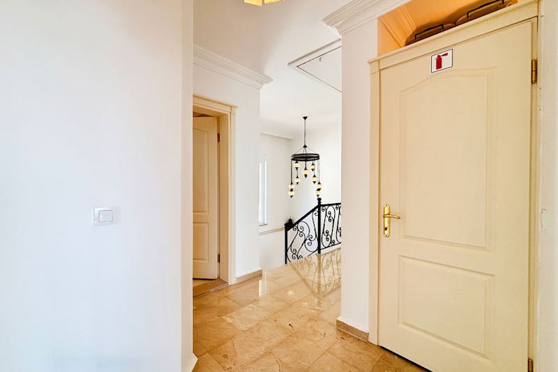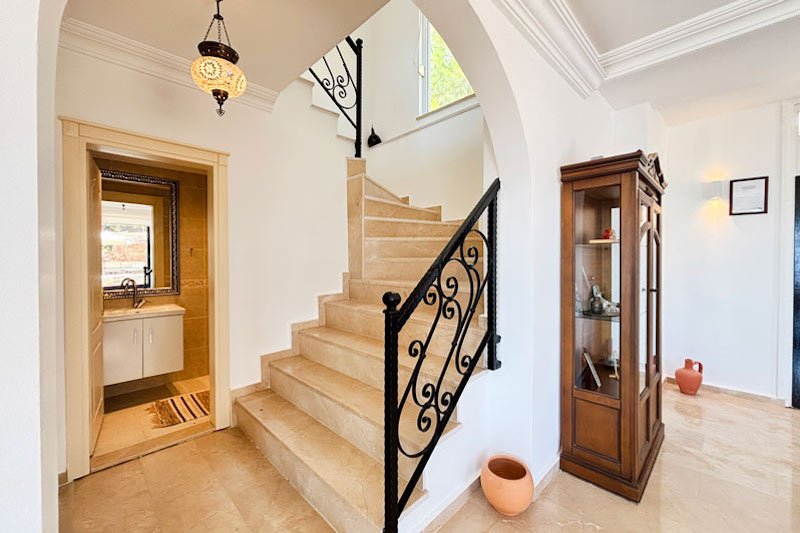 В просторном главном холле есть много места для хранения вещей, большой гостевой туалет и винтовая мраморная лестница, ведущая на верхний этаж виллы. Здесь расположены три просторные спальни с двуспальными кроватями, семейная ванная комната с душем и небольшая удобная кладовая. Во всех спальнях есть раздвижные двери, ведущие на балконы, где можно загорать и любоваться фантастическим видом на синее море и местное побережье. В роскошной главной спальне также есть современная ванная комната и собственный балкон.